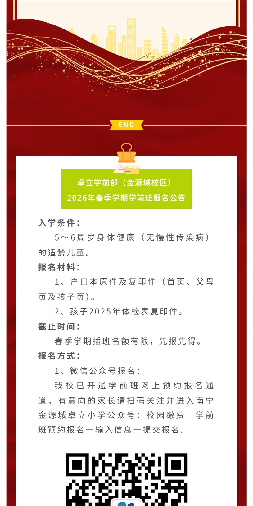 卓立学前部(金源城校区) 2026年春季学期学前班报名公告
