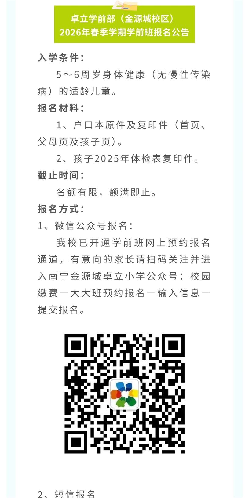 卓立学前部(金源城校区) 2026年春季学期学前班报名公告