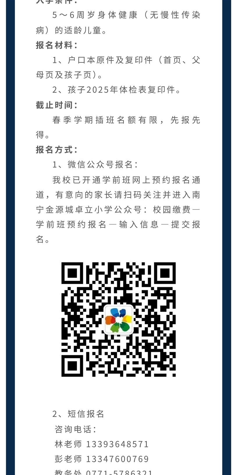 卓立学前部(金源城校区) 2026年春季学期学前班报名公告