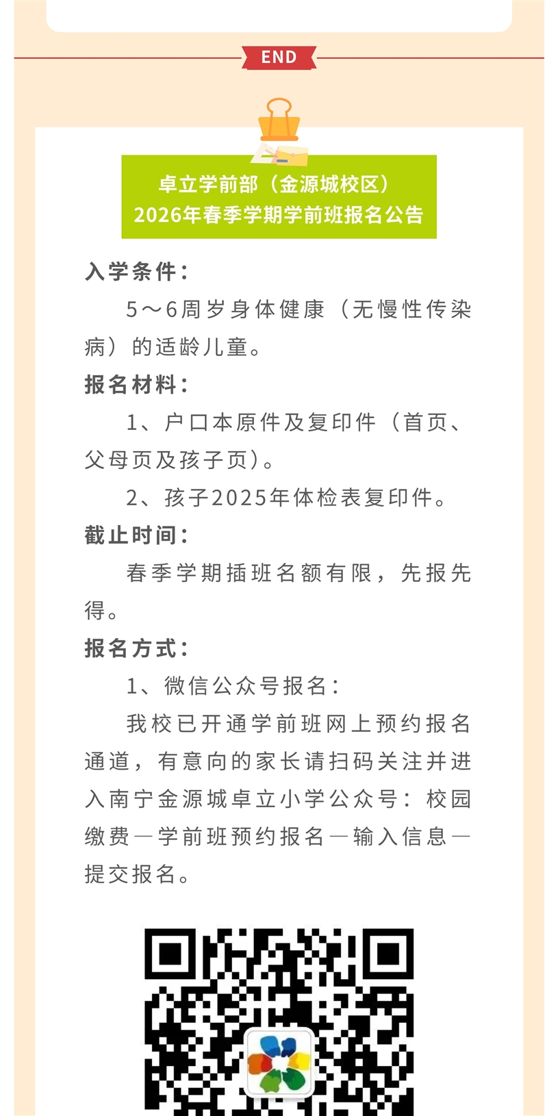 卓立学前部(金源城校区) 2026年春季学期学前班报名公告