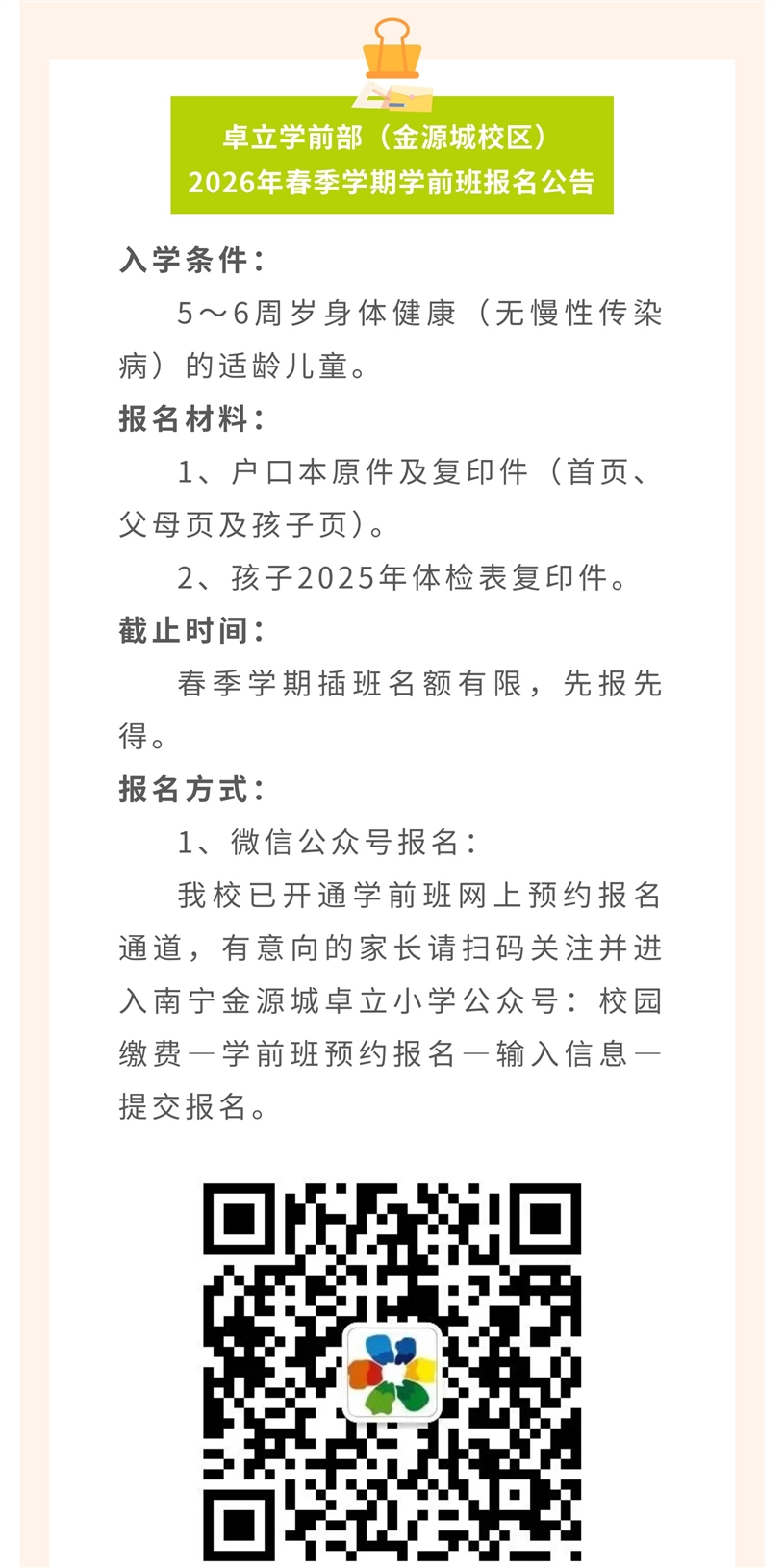 卓立学前部(金源城校区) 2026年春季学期学前班报名公告