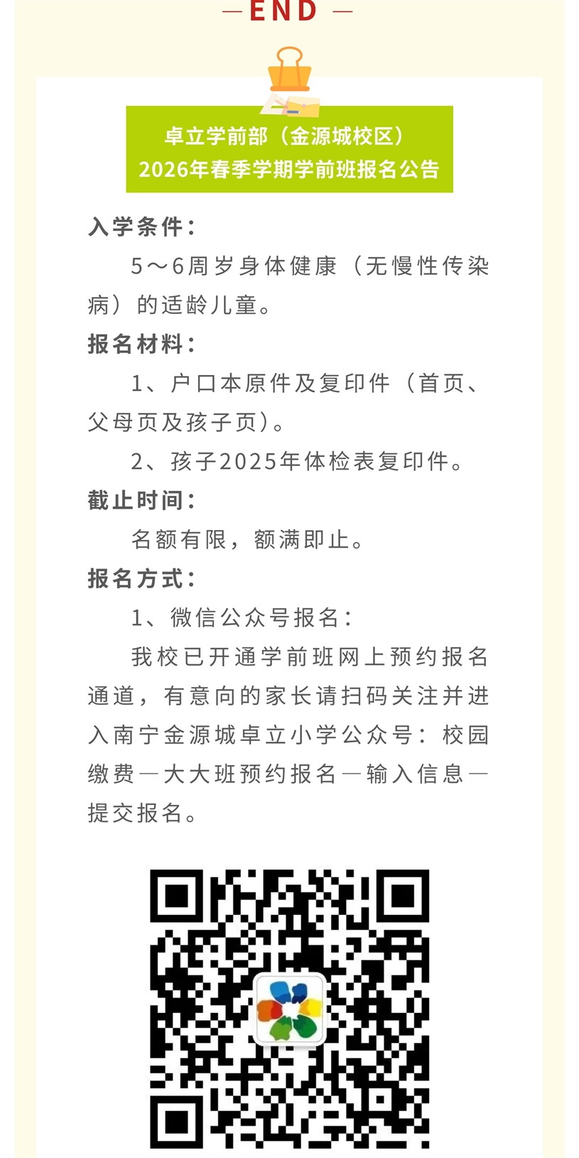 卓立学前部(金源城校区) 2026年春季学期学前班报名公告